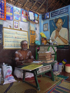 The tiṇṇai is often crowded and allows patients waiting for their turn to observe other consultations, turning Manikka’s sessions into public performances (Figure 2). He consults while sitting directly on the floor in a cross-legged posture behind a reading desk, which bears the Tamil inscription, “Astrologer M. Velayudham, Citta Physician.”[7] This posture is reminiscent of the way yogis, cittar,[8] and other Hindu holy persons, including the Tamil poet and saint Tiruvalluvar, are often depicted. His torso and forehead are coated with tirunīṟu, sacred ashes reminiscent of the deity Shiva (some Valluvar astrologers also wear the pūṇūl, the sacred thread). He does not practice in his everyday clothes, and instead usually wears a finely crafted white vēṣṭi (Figure 1). Manikka pays careful attention to his appearance. As Detienne ([1967] 2006, 114) suggests, bodily posture confers a particular force on the soothsayer’s speech, and in this setting it is complemented by a distinctive mode of dress within the defined space of the consultation.